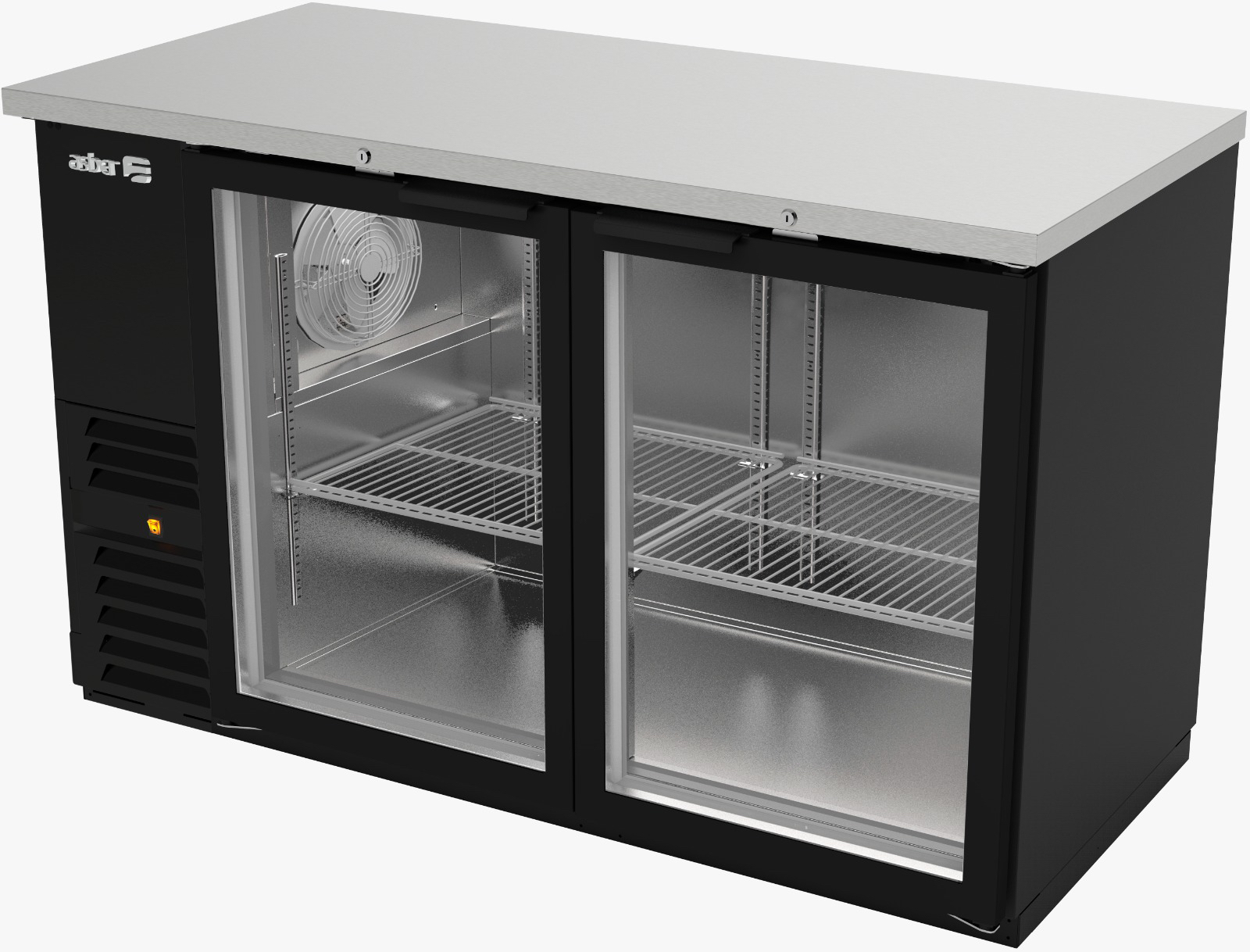 Enfriador Contrabarra de 19 ft3 de 2 puertas de vidrioy 4 parrillas fabricado en acero y cubierto con vinilo color negro, encimera fabricada en acero inoxidable austenítico, interiores con cantos sanitarios que cumplen los requerimientos de sanidad de la norma NSF7, R290, Rango de temperatura 0°C a 4°C, Capacidad para 640 botellas de 12 oz. Bar Line