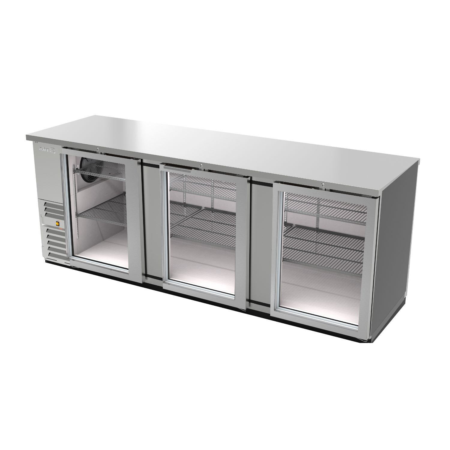 Enfriador Contrabarra de 34.4 ft3 de 3 puertas de vidrio y 6 parrillas, fabricado en acero inoxidable, encimera fabricada en acero inoxidable austenítico, interiores con cantos sanitarios que cumplen los requerimientos de sanidad de la norma NSF7, R290, Rango de temperatura 0°C a 4°C, Capacidad para 1200 botellas de 12 oz. Bar Line