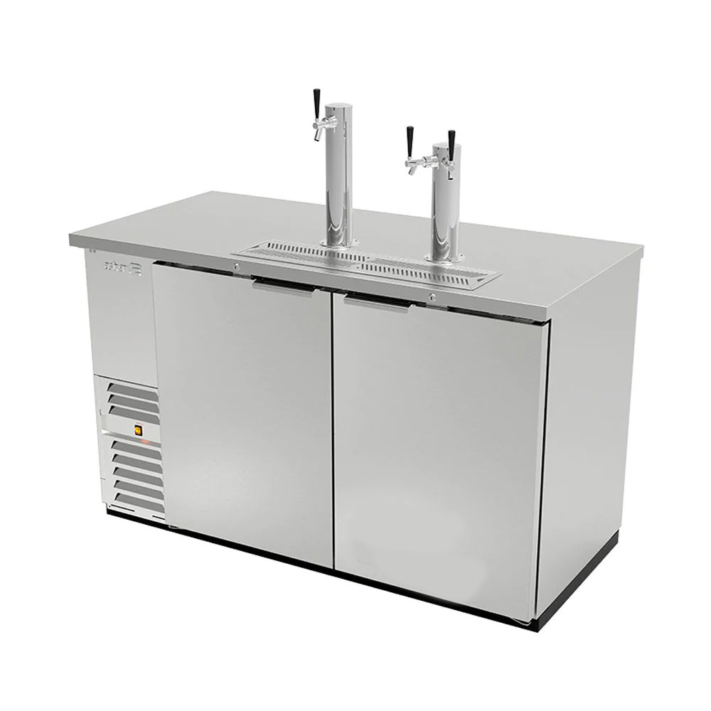 Dispensador Refrigerado de Cerveza de 2 puertas con capacidad de 2 Barriles de 1/2 (Dia.16-1/8”) con 2 Torres fabricada en acero inoxidable pulido y 3 grifos, fabricado en acero acero inoxidable, R290, Rango de temperatura 0°C a 4°C