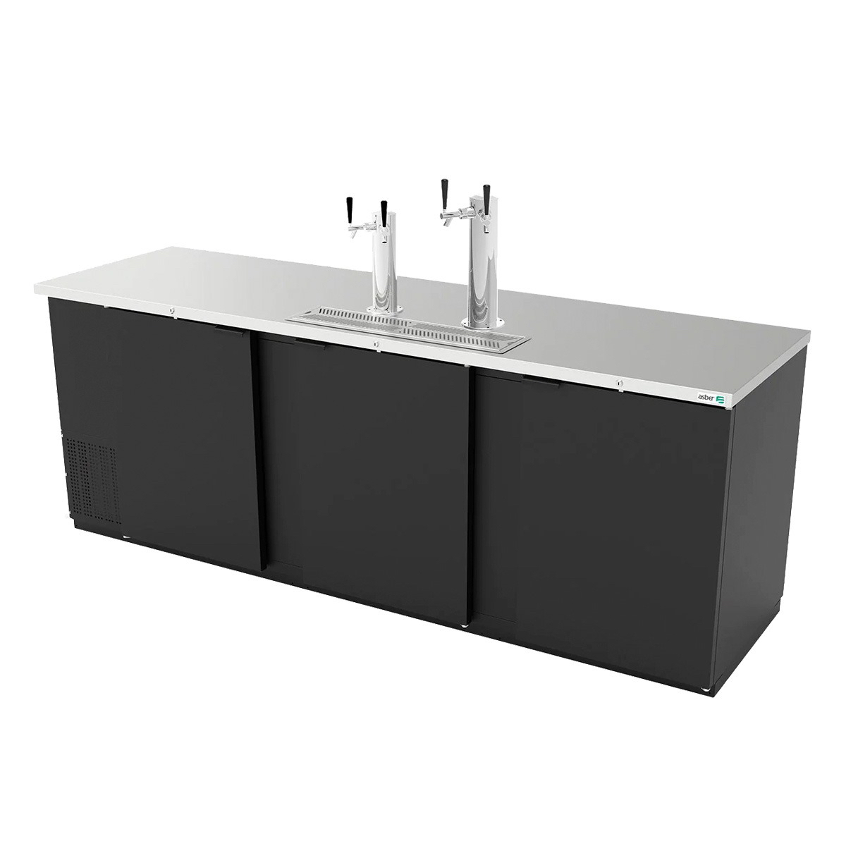 Dispensador Refrigerado de Cerveza de 3 puertas con capacidad de 5 Barriles de 1/2 (Dia.16-1/8”) con 2 Torres fabricada en acero inoxidable pulido y 4 grifos, fabricado en acero cubierto de vinilo color negro y encimera en acero inoxidable austenítico, R290, Rango de temperatura 0°C a 4°C
