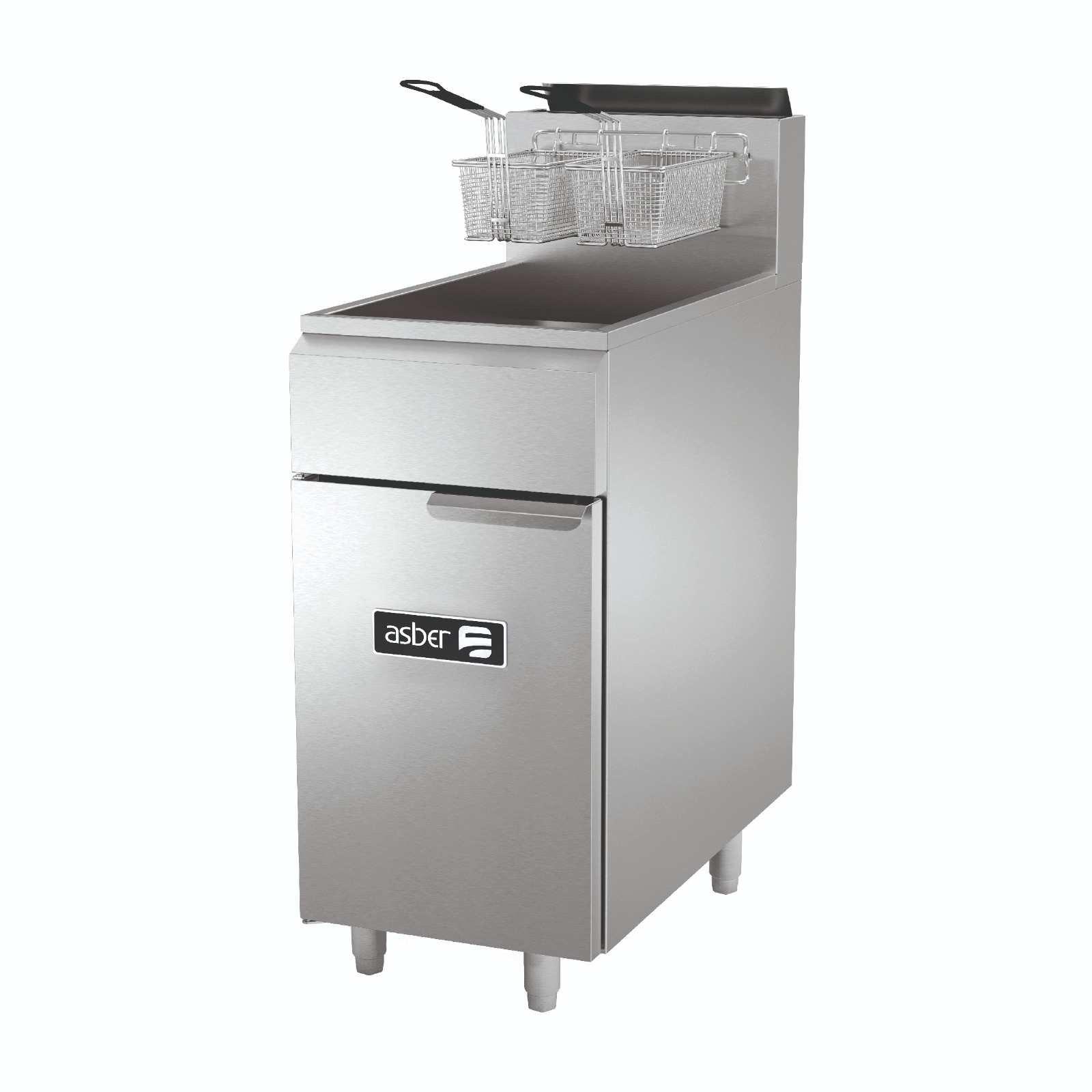 Freidora a gas Natural de 1 Tina y 3 quemadores, construcción exterior acero inoxidable austenítico y construcción de la tina en acero inoxidable, calibre 16, soporte para escurrimiento en alambran cromado, potentes quemadores “Guitarra” de última generación y alta capacidad 35,000 BTU/HR cada uno, controlados por termostato de 200°F a 400°F, Válvula de seguridad tipo minivolt con termófila, termostato de seguridad high limit que garantiza cierre de la válvula a 450°F, incluidas dos canastillas de alambran cromado y mango plastificado, rejilla de alambrón cromado para soporte de cestos, tubo y válvula de drenaje incorporados para facilitar vaciado de tina y limpieza y 4 patas tubulares regulables de 6” a 8”, capacidad de tina 50 Libras