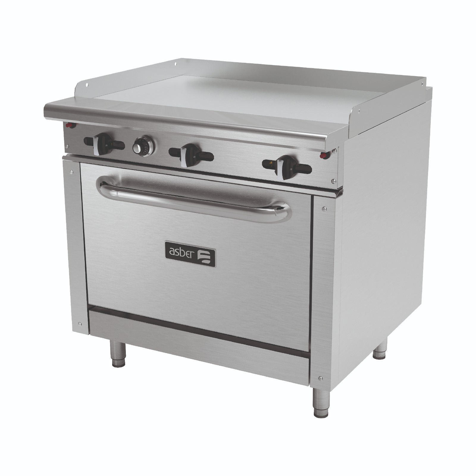 Estufa Combinada a gas Natural, Horno con potente quemador "U" de última generación y de alta capacidad, fabricado en acero inoxidable, con capacidad 30,000 BTU/HR, controlado por termostato de 250°F a 500°F, Plancha con potente quemador "U" de última generación, fabricado en acero inoxidable, capacidad 20,000 BTU/HR. Encendido a través de tubo conducción de flama, pilotos independientes para quemador, válvulas de gas reforzadas, certificadas ANSI/CSA. Manifolds en una sola pieza, abocardados por temperatura, Placa en Cold-Rolled de 3/4" de espesor soldada a cercha perimetral en acero inoxidable en calibre 14, Dotación de 1 parrilla de alambrón cromado ajustable en altura, Kit de 4 patas tubulares regulables en acero inoxidable 6" a 8". Capacidad Total 90,000 BTU/HR