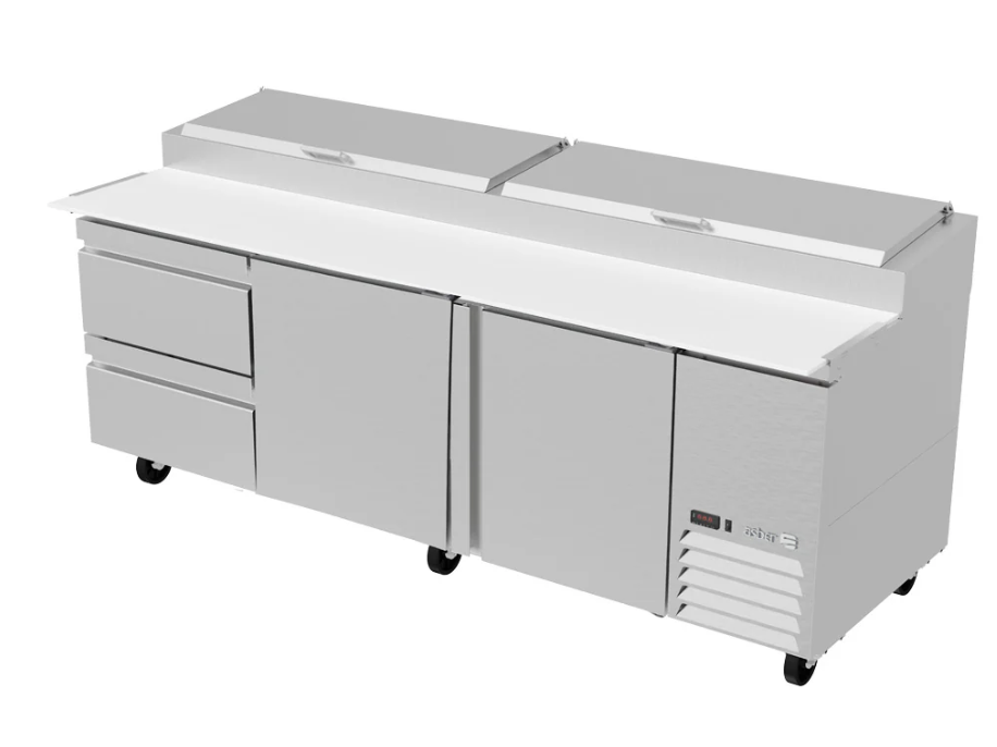 Mesa Refrigerada de preparación para Pizzas con 2 cajones y 2 puertas, 30.2 ft3 y 12 insertos, fabricada en acero inoxidable austenítico, interiores con cantos sanitarios de acuerdo a la norma NSF7, R290, Rango de Temperatura 0°C a 4°C, con tabla de Nylamid de 19” de ancho