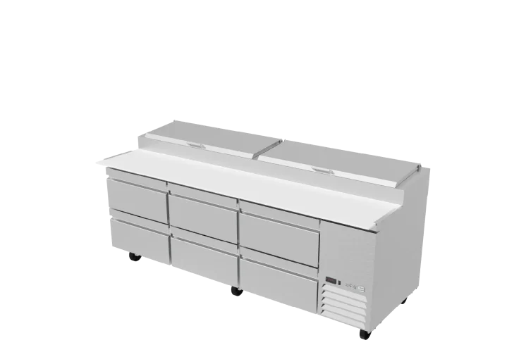 Mesa Refrigerada de preparación para Pizzas con 6 cajones 30.2 ft3 y 12 insertos, fabricada en acero inoxidable austenítico, interiores con cantos sanitarios de acuerdo a la norma NSF7, R290, Rango de Temperatura 0°C a 4°C, con tabla de Nylamid de 19” de ancho