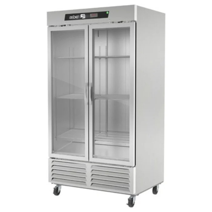 Enfriador 2 Puertas de Vidrio 37 ft3 construidos en Acero Inoxidable Austenitico, interiores con cantos sanitarios que cumplen norma NSF7, R290, Rango de Temperatura 0°C a 4°C
