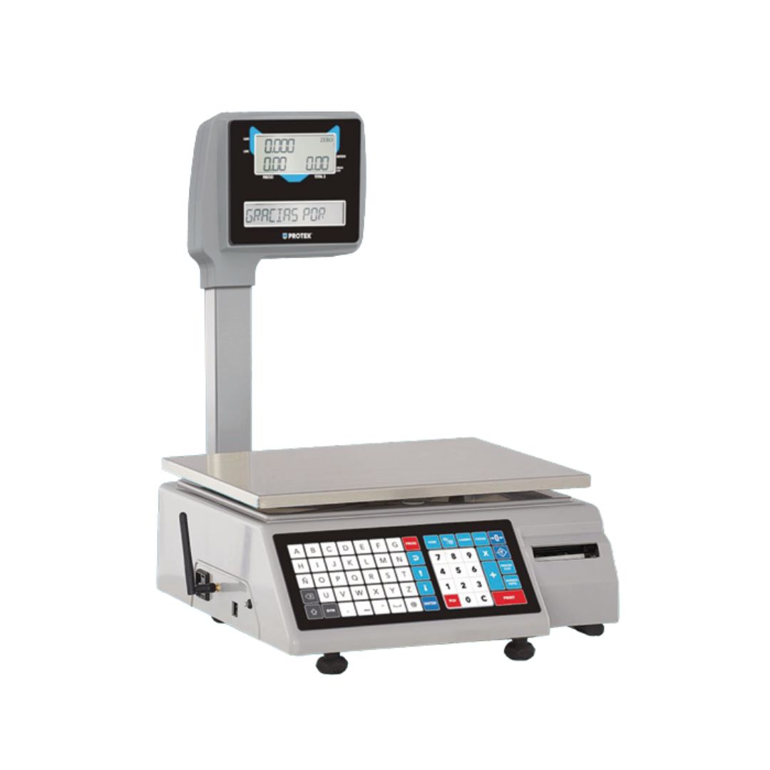Báscula electrónica con capacidad de 40 kg, fabricada en acero inoxidable, impresor térmico para papel o etiqueta, conectividad Ethernet y WiFi, funciones de caja registradora, cálculo de cambio y corte de ventas diario, display doble para operador y cliente, luz en pantalla para mayor visibilidad, 350 memorias de acceso directo a productos