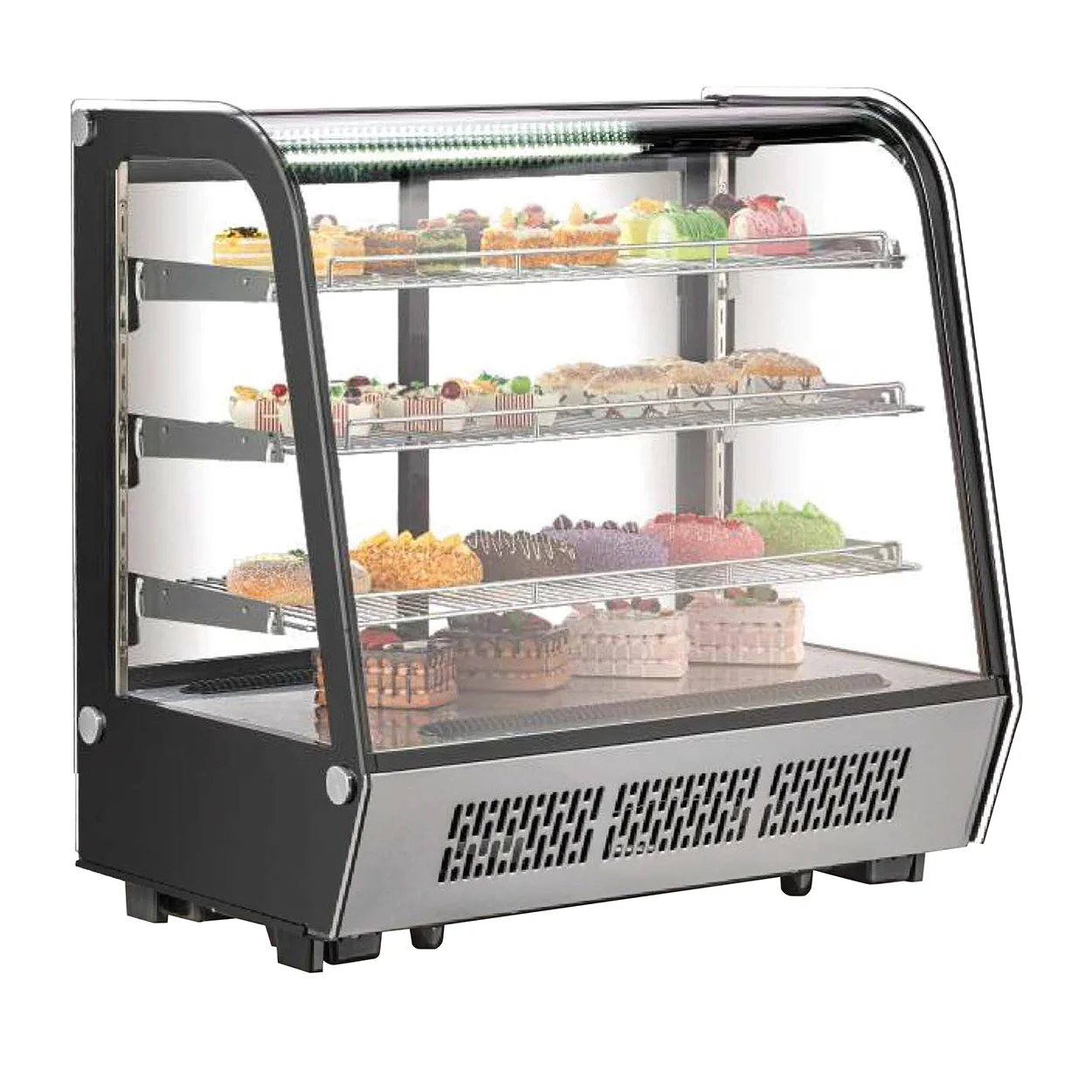 Vitrina refrigerada cristal curvo de 4 niveles, máxima exhibición, con 3 entrepaños y piso para espacios reducidos, tiene capacidad de 145 litros, color acero y negro, iluminación LED, puertas traseras corredizas, control de temperatura digital, refrigerante R290, rango de temperatura ajustable 2°C a 12°C, 110V/60HZ