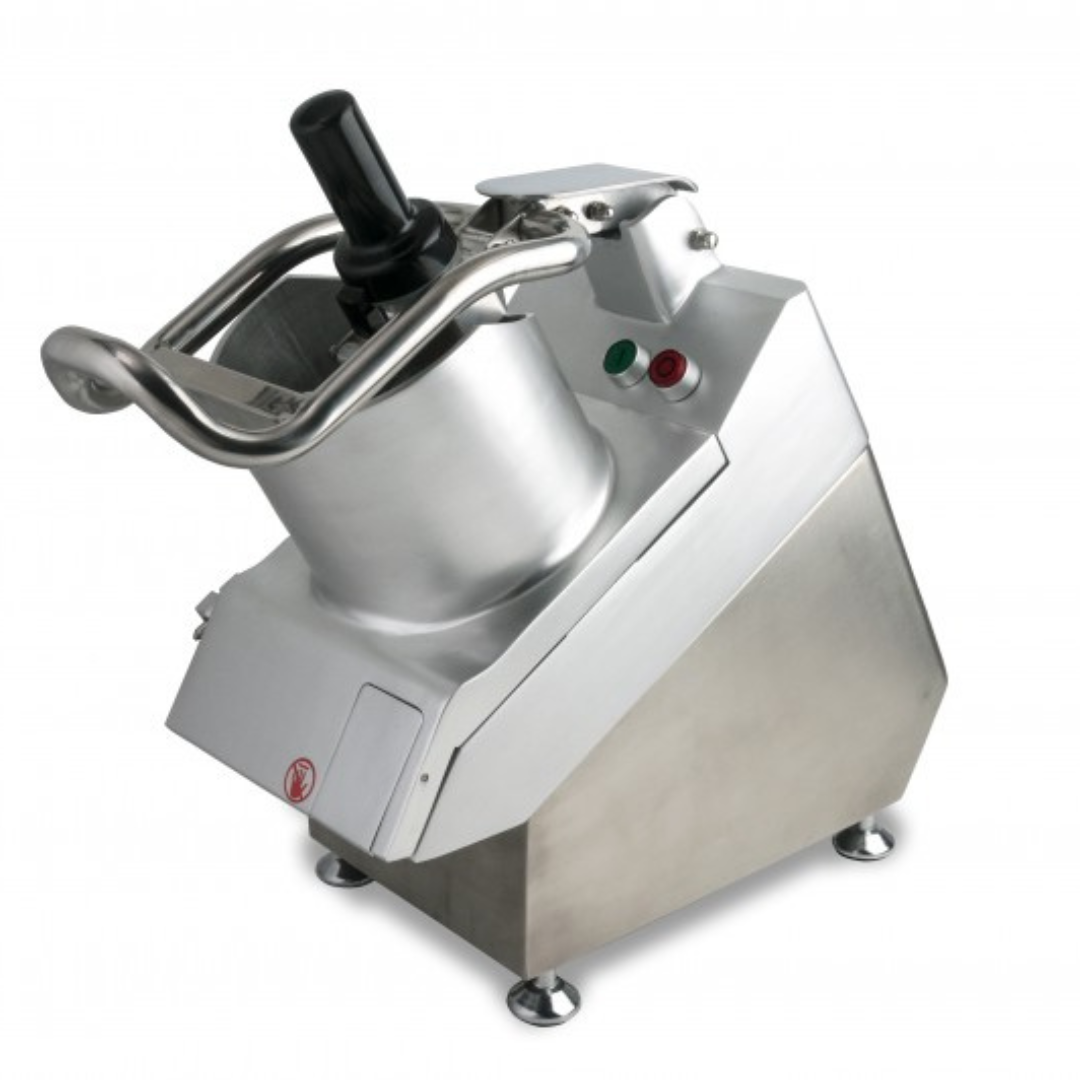 Procesador de vegetales y alimentos construido en acero inoxidable y aluminio fundido, cuenta con un catálogo de 5 discos intercambiables con los que se puede rebanar, rallar alimentos, cortar en cubo o bastones, 2 sensores de seguridad para operación mas confiable, empujador debe que puede ser usado en su totalidad o en la parte central para productos pequeños, velocidad 1800 RPM, Potencia 1 HP